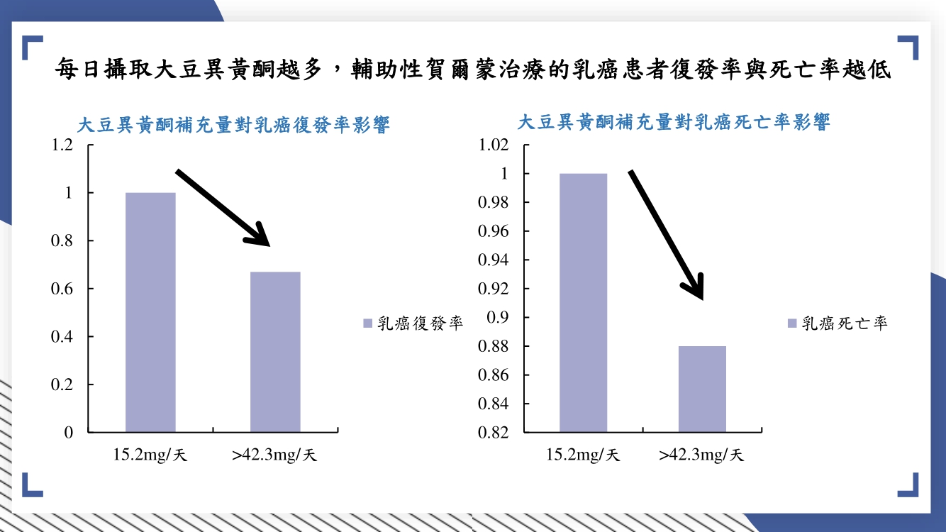 乳癌一直是國內女性癌症十大死因的前兩名,表示對於乳癌患者需要更密切的注意身體的變化,對於國內知名女性歌手因乳癌離世的不幸消息,再度提升了國人對乳癌的重視,而根據研究指出,每日補充>42.3mg的大豆異黃酮,能顯著降低乳癌患者的乳癌復發率與死亡率,因此除了積極配合醫師擬定治療方案外,從營養角度的攝取也可以減少病情負擔,達到理想的結果!
