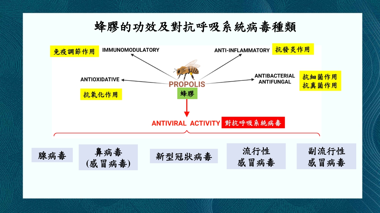 蜂膠是由蜜蜂蜜蜂採集多種植物的樹脂物質如花粉、樹脂混合的膠狀物質並與蜂體大顎腺分泌物混合製成,具有隔離細菌、病毒,保護蜂巢與蜜蜂安全的功能,被譽為天然抗生素,根據研究指出,蜂膠具有免疫調節作用、抗氧化作用、抗發炎作用、抗細菌、真菌作用等,也因此可以幫助體內對抗許多病毒如腺病毒、感冒病毒、流行性感冒病毒、副流行性感冒病毒、新型冠狀病毒等,具有對抗呼吸系統病毒能力,因此在這病毒肆虐的時代,建議可以補充蜂膠來提升體內抗呼吸道病毒能力!