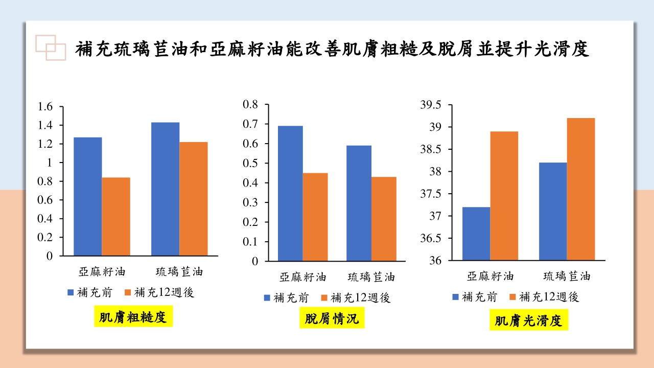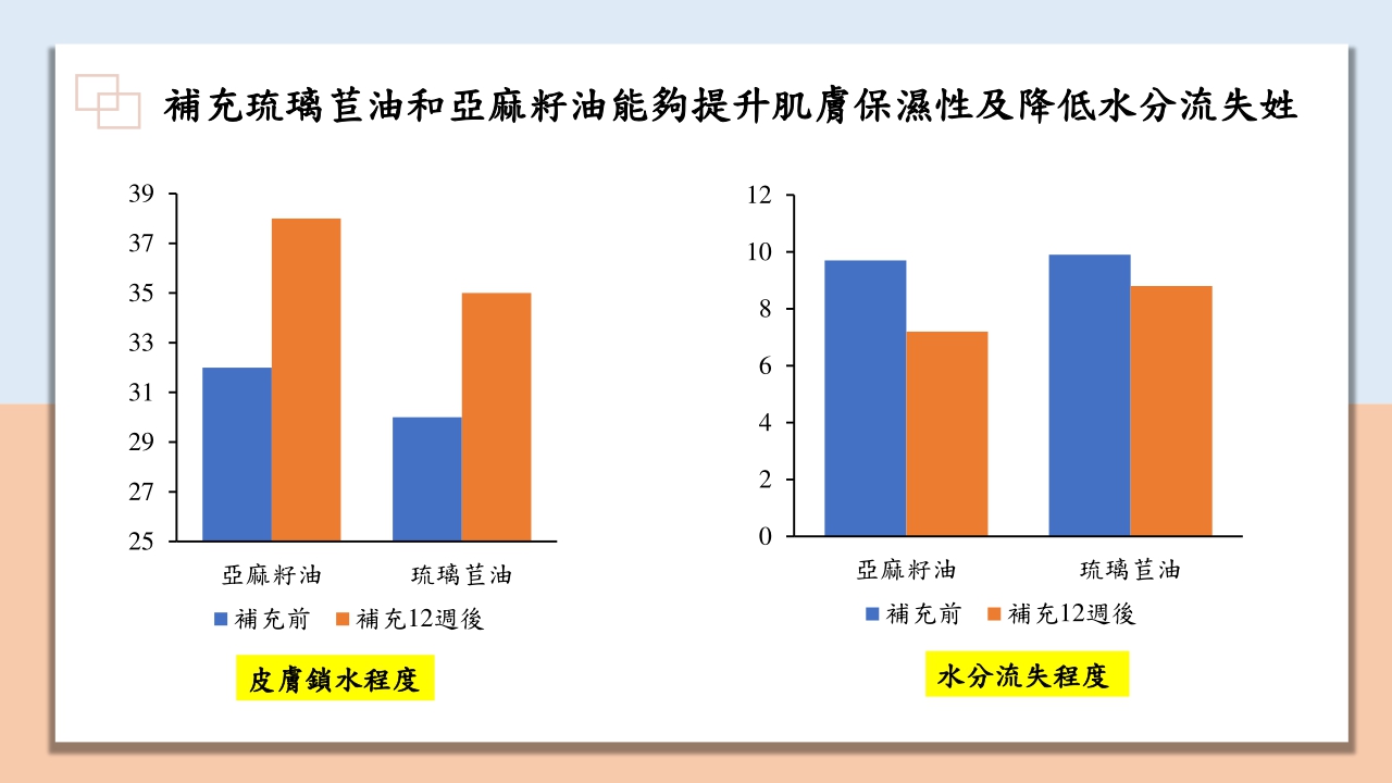 近期國內的口罩大解禁後,因為歷時三年多的口罩禁令,已經有許多民眾有所謂的「口罩醜陋症」,可能因長時間配戴口罩導致皮膚彈性變差等原因,根據發表在《英國營養學雜誌》研究指出,補充亞麻籽油和琉璃苣油能夠有效提升肌膚鎖水度及降低肌膚水分流失情況,此外也能夠改善皮膚粗糙及皮屑程度,提升肌膚光滑度的效果,因此在口罩解禁的同時,可以開始補充好油來讓肌膚情況獲得明顯改善效果!