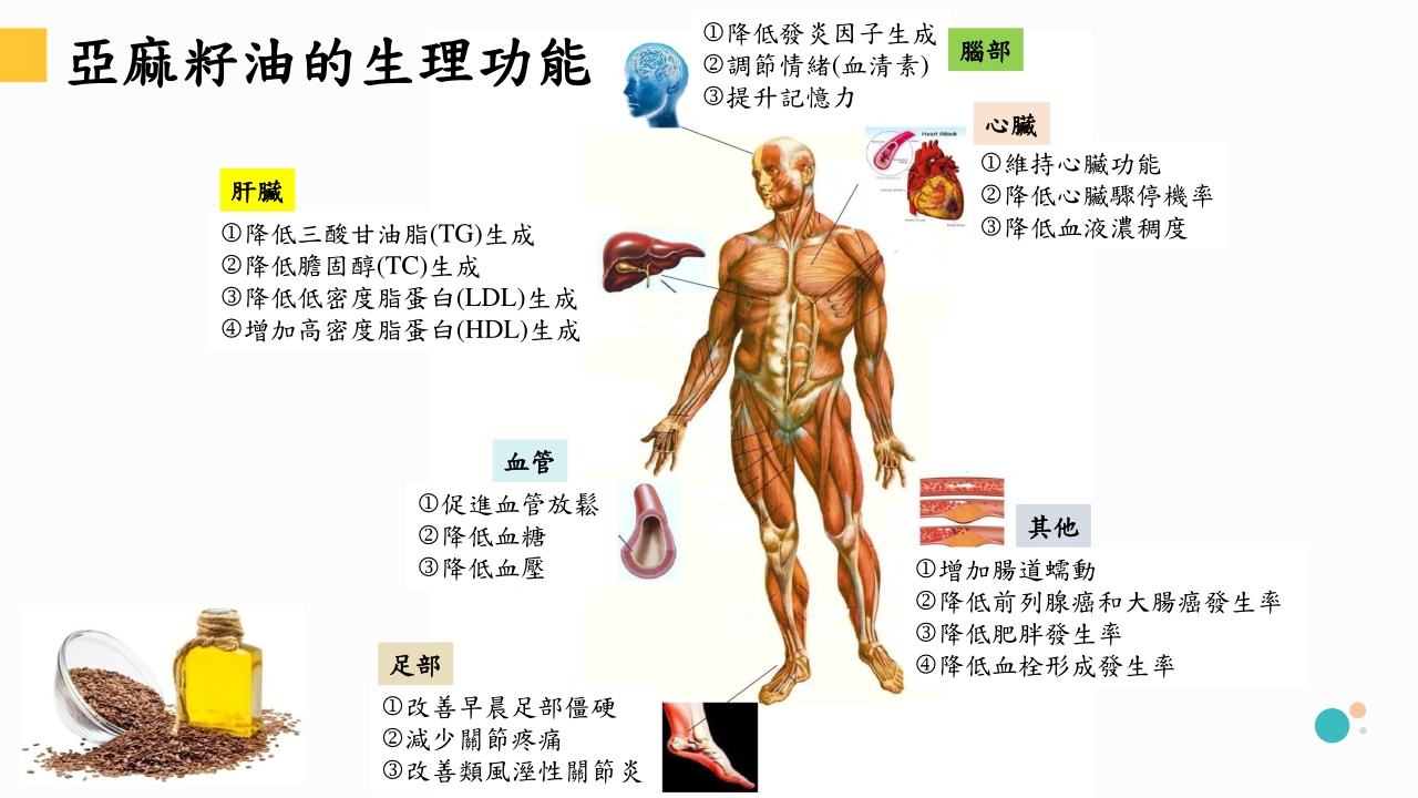 亞麻子油富含各種不同的Omega脂肪酸種類,其中包含Omega-3、Omega-6及Omega-9,也因此讓亞麻籽油具有諸多功效,根據研究指出,亞麻籽油能幫助腦部降低發炎因子生成、調節情緒;能幫助降低諸多血脂如三酸甘油脂、膽固醇、LDL等;也能幫助血管放鬆、降低血壓及血糖;還能改善足部的僵硬感及關節的疼痛感,因此適量補充可以達到諸多功效,在平常飲食中不妨增加一些Omega-9的攝取,可以讓身體狀況更加有活力!