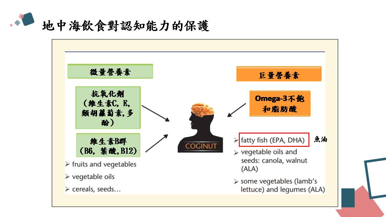 地中海飲食(Mediterranean diet )的特點是大量食用水果、蔬菜、豆類、穀物和橄欖油作為添加脂肪的主要來源,適度食用魚和酒,少量食用肉類和奶製品作為補充脂肪的來源。法國流行病學研究證實, 較高的地中海飲食依從性與老年人認知能力下降較慢有關。而這種保護作用是來自富含omega-3不飽和脂肪酸的魚油!!