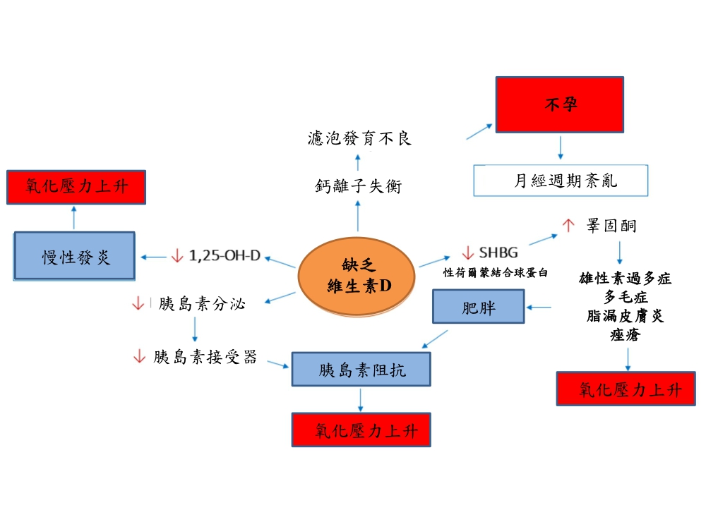 而多囊性卵巢症候群PCOS是一種很常見的婦科內分泌疾病而多囊性卵巢症候群, 還會出現胰島素抗阻的狀況,衍生新陳代謝疾病和肥胖問題,更會影響排卵,造成不孕!如果有PCOS的婦女朋友,建議補充維生素D來幫助改善胰島素阻抗和脂質代謝,減少過高的雄性激素,幫助正常排卵與卵子發育。