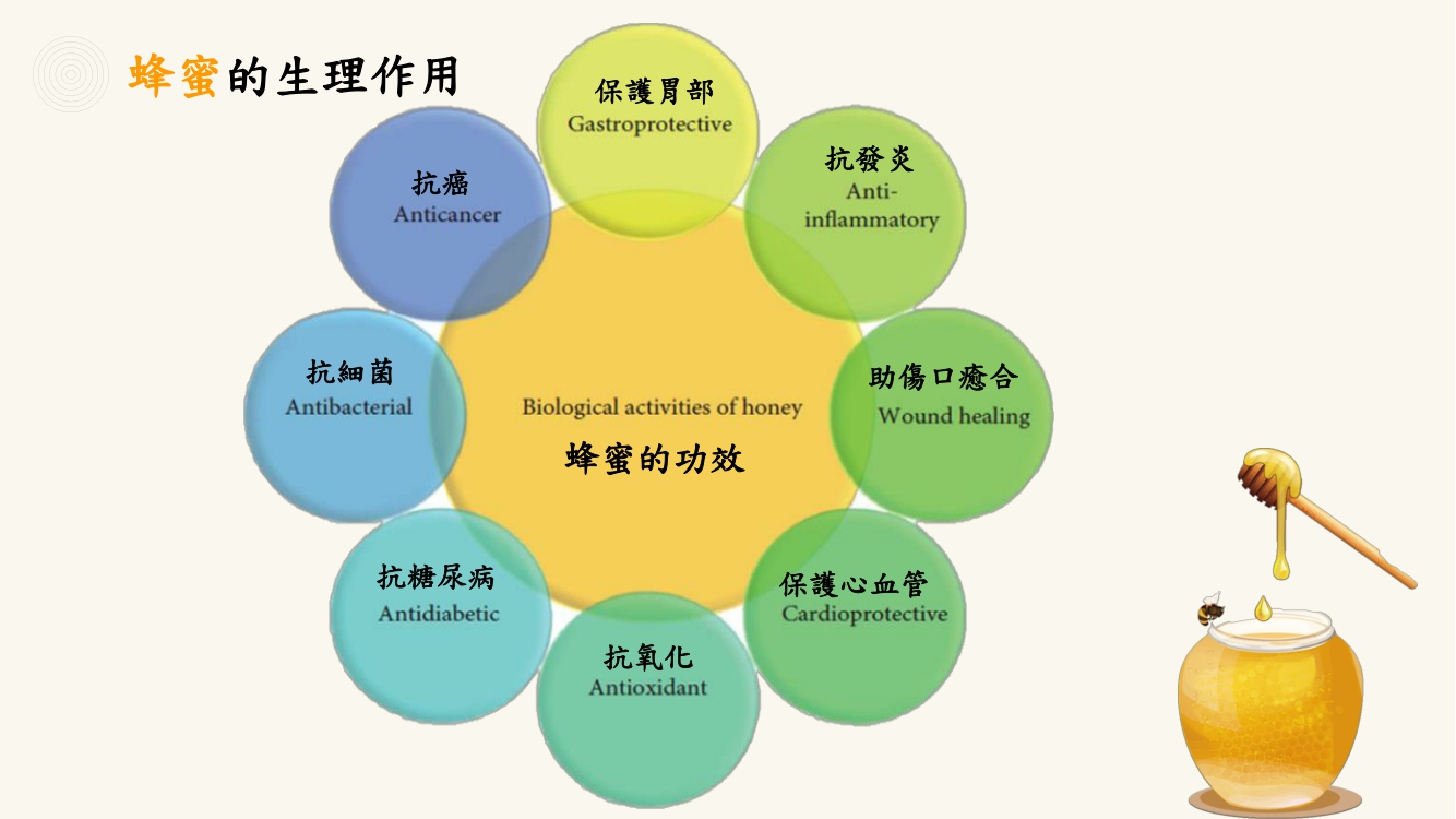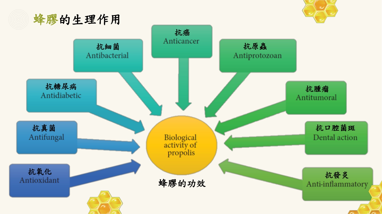 蜂膠、蜂蜜和蜂王乳一直是市售常見的蜂製品,雖然都是由蜜蜂所製成,但功效卻是大不相同的!根據馬來西亞學者的研究指出,蜂膠具有抗氧化、抗真菌、抗糖尿病、抗細菌、抗癌、抗原蟲、抗腫瘤、抗口腔菌斑及抗發炎等作用;蜂蜜具有保護胃部、抗發炎、助傷口癒合、保護心血管、抗氧化、抗糖尿病、抗細菌及抗癌等作用;而蜂王乳具有抗氧化、抗腫瘤、抗老化、抗腦神經衰退及抗發炎等作用,由此可知不同的蜂製品其實功效是不一樣的!