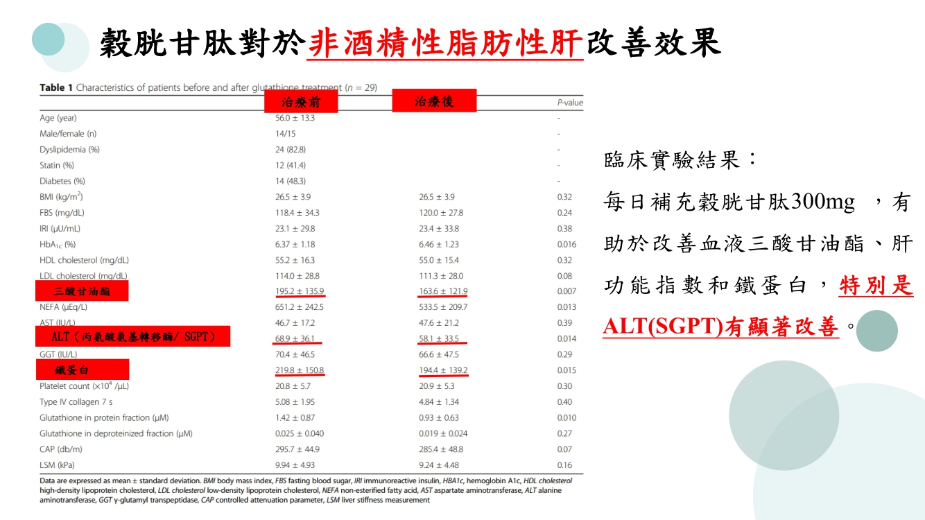 研究結果證實:每日補充穀胱甘300mg ,有助於改善血液三酸甘油酯、肝功能指數和鐵蛋白,特別是ALT(SGPT)有顯著改善。