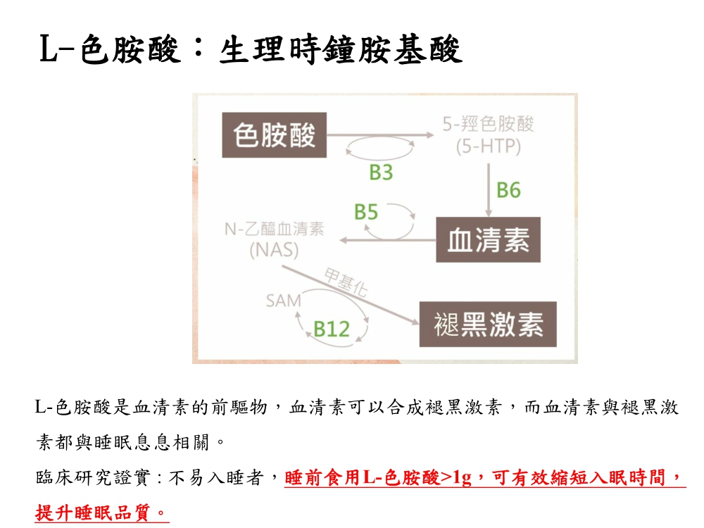 臨床研究發現: 補充L-色胺酸 (L-Tryptophan)有助於縮短入睡時間 , 減少入睡後早醒的情況, 對於提升睡眠品質有幫助。