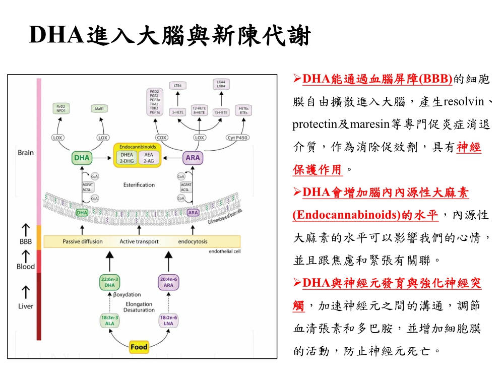 研究證實: DHA能通過腦血管障壁(BBB),進入大腦後對神經元有保護作用, 還能產生內源性大麻素, 不僅影響情緒, 還與體重控制. 心血管健康有關聯, 甚至具有提升生殖系統健康的好處, 透過營養品補充DHA最有安全且有效率的!!