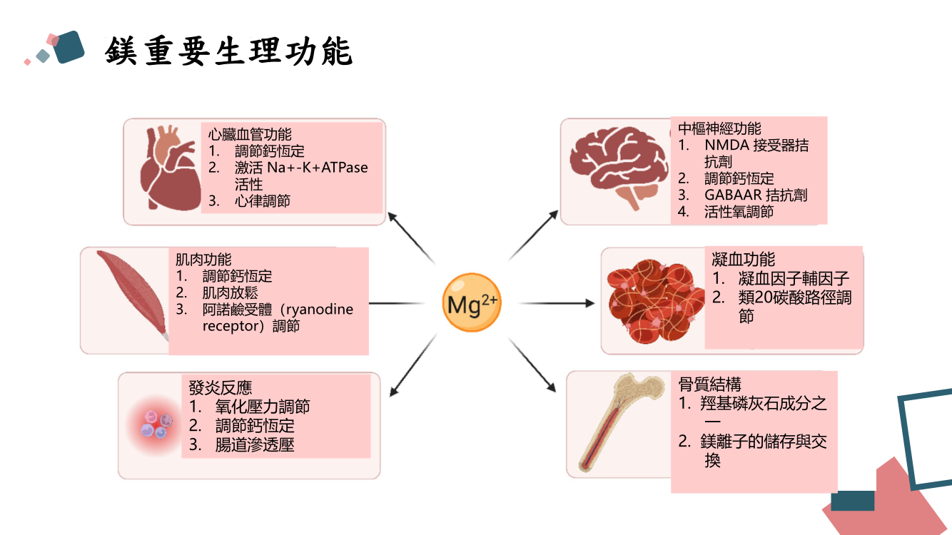 鎂是維持骨骼之結構及功能的重要元素,為人體細胞內超過 300 個酵素之輔因子,並參與細胞內信號傳遞之過程及蛋白質合成作用,對細胞分裂非常重要。