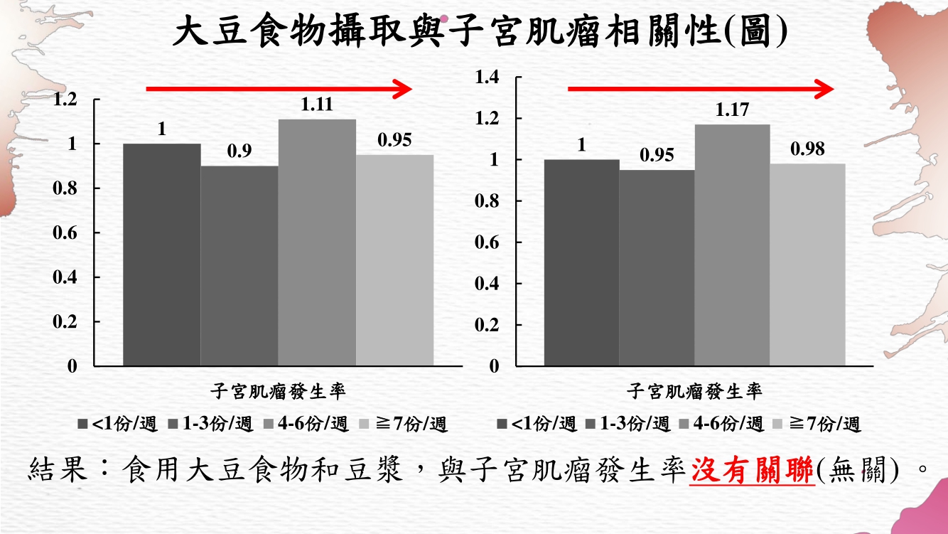 面對擁有「婦科第一瘤」的子宮肌瘤以及站在女性癌症死因第三名的乳癌來說,能不能攝取含植物性雌激素食物(如大豆異黃酮、山藥)的說法一直爭論不休,一派主張不能攝取,原因是雌激素會讓子宮肌瘤增生;另一派則主張不影響,原因是因為受體以及動物性(人體)和植物性雌激素結構上的不同。事實上台灣食藥署(TFDA)在「食藥闢謠專區」的回覆提到大豆異黃酮/山藥所含DHEA都無法直接增加人體的雌激素,而國際研究都已證實食用黃豆製品如豆漿/大豆食物都不會影響到子宮肌瘤的或是乳癌的發生率,因此只要在不過量的情況下都是很安全且不影響的!