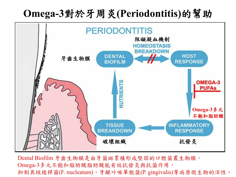 omega-3脂肪酸有效抗發炎與具有抗菌作用,可抑制具核梭桿菌(F. nucleatum)、牙齦卟啉單胞菌(P. gingivalis)等病原微生物的活性。魚油是維持口腔健康的不可或缺的補充品喔。