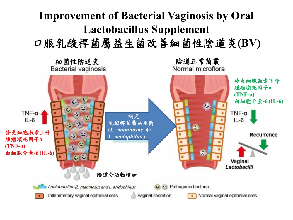 臨床研究證實, 口服補充乳酸菌桿菌屬(Lactobacillus)益生菌,例如L. rhamnosus 鼠李糖乳酸桿菌: ,有助於支持陰道正常pH 值, 抑制有害菌, 降低發炎激素: 白細胞介素 (IL)-6、和腫瘤壞死因子-α (TNF-α ), 也可維持陰道上皮細胞緊密連接, 促進上皮細胞完整, 幫助組織癒合, 預防再度感染。
