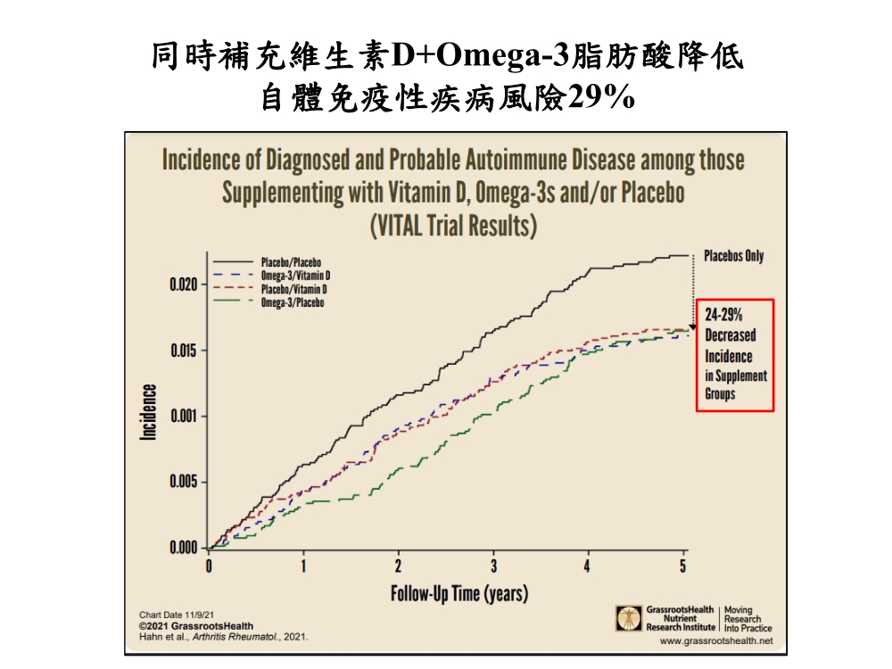 一項大型且最新的臨床研究指出:自體免疫疾病風險較高者, 補充維生素D 2000IU+魚油 1000毫克/天, 有助於降低自體免疫疾病發病率29%