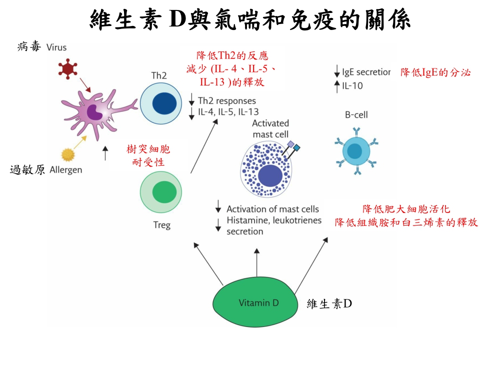 維生素D還能透過降低Th2反應, 以減少觸發細胞激素IL- 4、IL-5、IL-13 等的釋放,達到降低氣喘的發生。