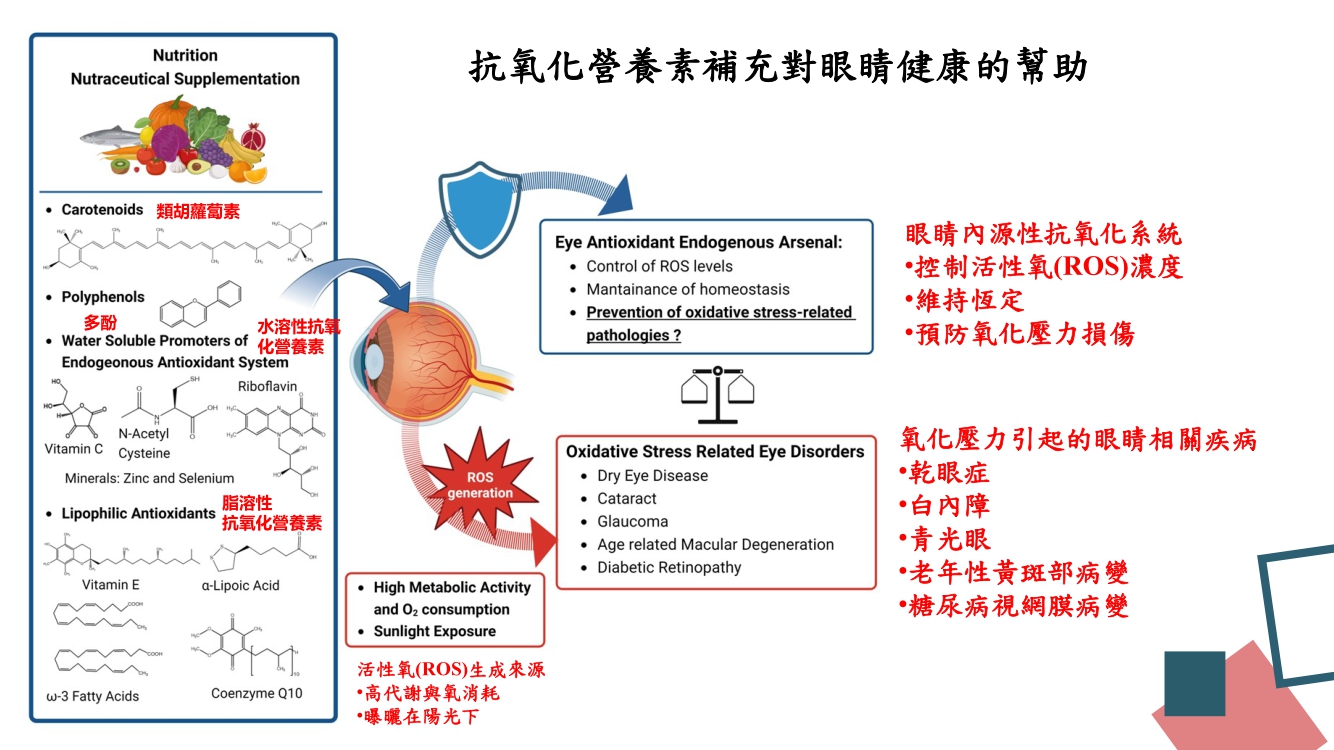 臨床研究指出:除了我們熟知的葉黃素和玉米黃素之外, 許多具有抗氧化潛力的營養素, 例如:穀胱甘肽、CoQ10 、維生素 B2、C 和 E、鋅和硒以及 omega-3 多元不飽和脂肪酸等也建議一起補充,可顯著降低因老化引起的眼睛相關疾病。研究中特別指出,維生素 B2有助於保護視網膜免受氧化損傷,並提高腦源性神經營養因子(BDNF) 水平。還可增加眼睛中GSH 和 SOD 的產生,更有助於吸收紫外線UVB,減少光線對眼睛的傷害。