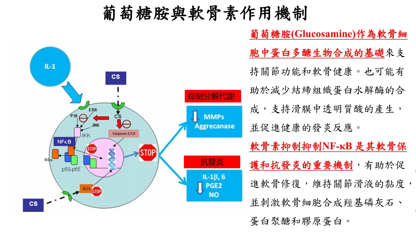 而葡萄糖胺和軟骨素(軟骨的兩種結構成分)在治療退化性關節炎方面確實存在協同作用,一項系統性回顧和統合分析,觀察時間從 6 週到 2 年研究結果明確指出: 葡萄糖胺和軟骨素一起食用對於膝關節炎患者的關節疼痛、腫脹和功能障礙有更好的改善效果。