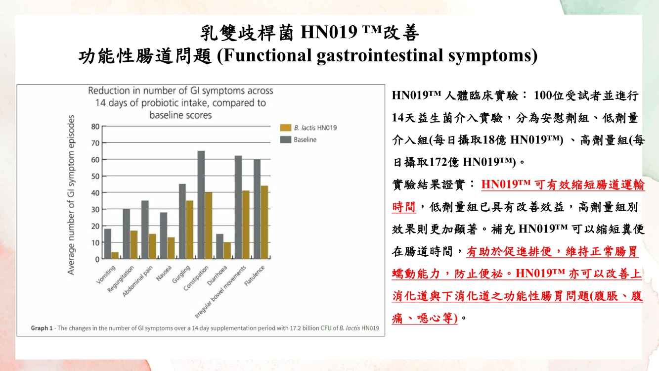 臨床研究證實: 乳雙歧桿菌 HN019 證明可以緩解胃腸道問題。給予100位受試者並進行14天益生菌乳雙歧桿菌 HN019 介入實驗,結果證實乳雙歧桿菌 HN019 可以改善受試者上消化道與下消化道之功能性腸胃問題(腹脹、腹痛、噁心等),有效改善腸躁症。