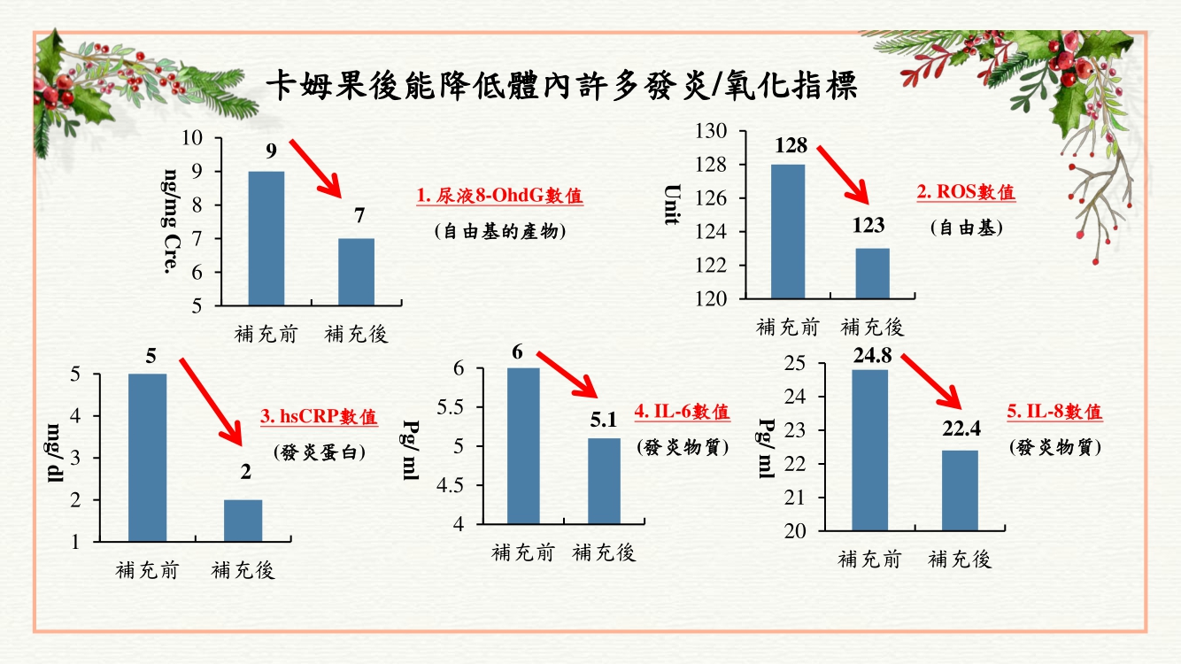 「卡姆果」是一種桃金孃科的常綠灌木,為生長在亞馬遜熱帶雨林河岸的灌木果實,因為含有超高含量的維生素C,更被當地人獲奉為「超級食物」,根據日本心臟專科團隊研究指出,卡姆果能夠降低體內許多發炎指標以及氧化指標,例如尿液8-OhdG數值(自由基產物)、ROS數值(自由基物質)、hsCRP數值(發炎物質)、IL-6數值(發炎物質)、IL-8數值(發炎物質),而這些數值都與人體健康息息相關,而在氧化壓力過高以及發炎物質過多情況下,就可能造成膚質明顯變差,甚至會有暗沉及皺紋產生,因此對於美白來說,卡姆果是不可或缺的要點之一!