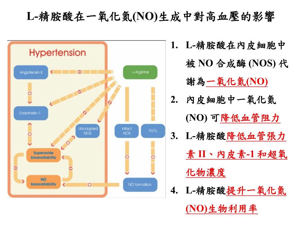 除了按照醫囑服藥控制之外,研究發現,一氧化氮最受認可作為血管擴張劑,促進健康的血壓和血流。 而補充L-精胺酸可在內皮細胞中被 NO 合成酶 (NOS) 代謝為 NO一氧化氮, 一氧化氮 (NO) 的增加會導致血管阻力降低,上皮細胞中一氧化氮 (NO) 的增加會減少腎小管鈉的再吸收,對於降低動脈壓有良好的效果。