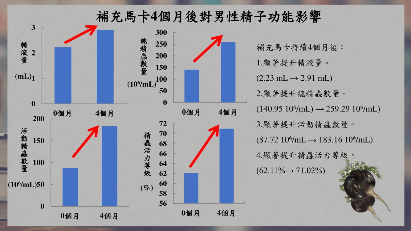 根據醫院統計發現,近年來男性的不孕機率大幅提升,其可能原因包含現代人生活壓力大、塑化劑等環境荷爾蒙,而這些情況都可能導致男性精液品質不良、精蟲數量及活動力減少等情況出現,而根據任職於祕魯卡耶塔諾·埃雷迪亞大學的Gustavo F. Gonzales教授表示,補充馬卡能1.顯著提升精液量2.顯著提升總精蟲數量3.顯著提升活動精蟲數量4.顯著提升精蟲活力等級,由此可知馬卡是能提升男性助孕的最新聖品!