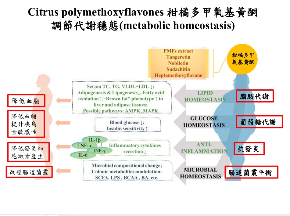 臨床研究發現: 從柑橘類萃取來的柑橘多甲氧基黃酮(citrus polymethoxyflavones) 對於降血膽固醇有很好的效果, 甚至對於三酸甘油酯和LDL的控制都比紅麴的效果更佳,研究也發現柑橘多甲氧基黃酮(citrus polymethoxyflavones) 不僅能調節脂肪代謝, 在血糖、抗發炎和腸道菌叢生態平衡都有益處, 從根本調節人體代謝, 進而預防代謝症候群的發生。