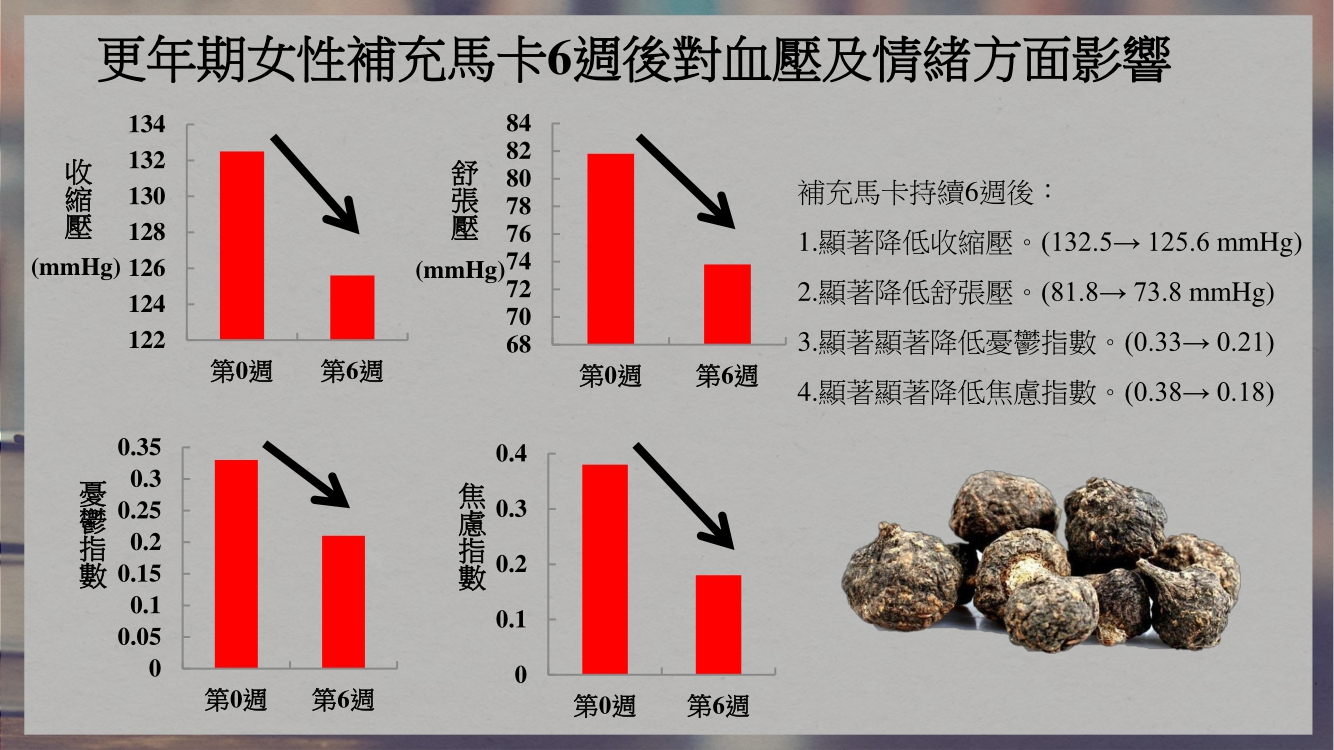 祕魯頂級黑馬卡在許多健康資訊中提到對男性的諸多幫助,但其實產後女性對於黑馬卡的補充也有諸多效果,根據發表在《國際更年期學會》期刊研究指出,馬卡可以1.顯著降低血壓(收縮壓) 2.顯著降低血壓(舒張壓) 3.顯著顯著降低憂鬱指數 4.顯著顯著降低焦慮指數,因此對於產後心情不美麗的女性而言,祕魯黑馬卡也能適時幫助您!