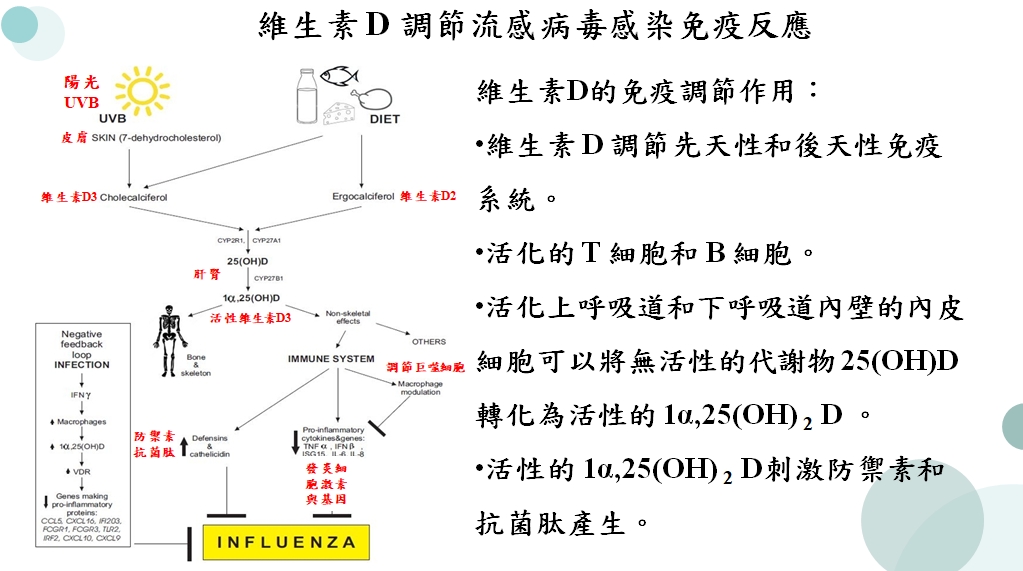 活性的維生素D3刺激防禦素和抗菌肽產生。還有強化抗菌及自體吞噬(autophagy)的作用來保護呼吸系統。