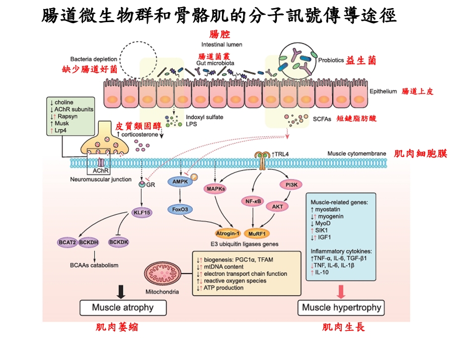 腸道微生物群可以透過參與肌肉激素(myokines)與脂肪激素(adipokines)的代謝、胰島素敏感性調節等,與肌肉減少相關的內分泌系統相互作用,從而影響肌肉功能。