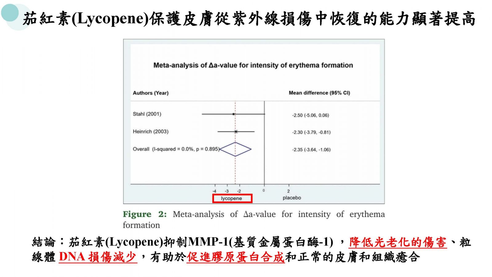 茄紅素(Lycopene)抑制MMP-1(基質金屬蛋白酶-1) ,降低光老化的傷害、粒線體 DNA 損傷減少,有助於促進膠原蛋白合成和正常的皮膚和組織癒合