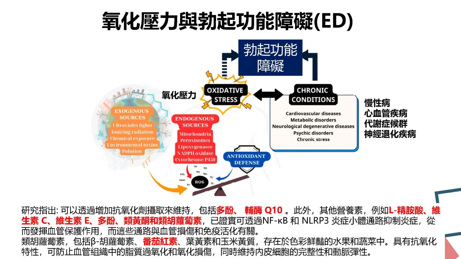 營養師建議: 久坐、抽菸、缺乏運動的男性朋友們 ,可透過補充含有L-精氨酸、維生素 C、維生素 E、多酚、輔酶 Q10、番茄紅素等抗氧化劑調節發炎訊號通路,最大限度地減少睪丸氧化損傷,從而促進內源性睪固酮的生成。富含抗氧化劑的飲食模式,例如地中海飲食,與降低勃起功能障礙盛行率、改善胰島素敏感性和減少全身性發炎。
