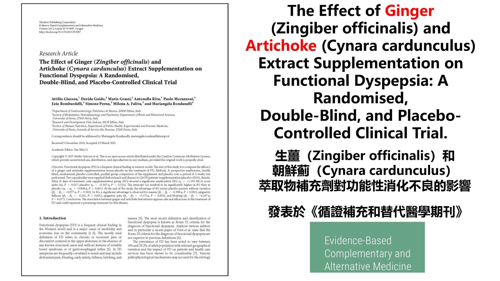 在另一項試驗中,服用朝鮮薊和薑混合物的人中,有63%的人在四周後腹脹、噁心、腹痛和其他消化不良症狀明顯減少。