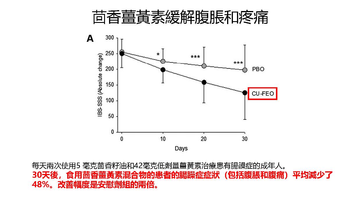 在一項臨床試驗中,茴香和薑黃素的組合使腸躁症的症狀緩解了50 %,並且在30 天後, 26%的使用者的所有症狀都消失了。