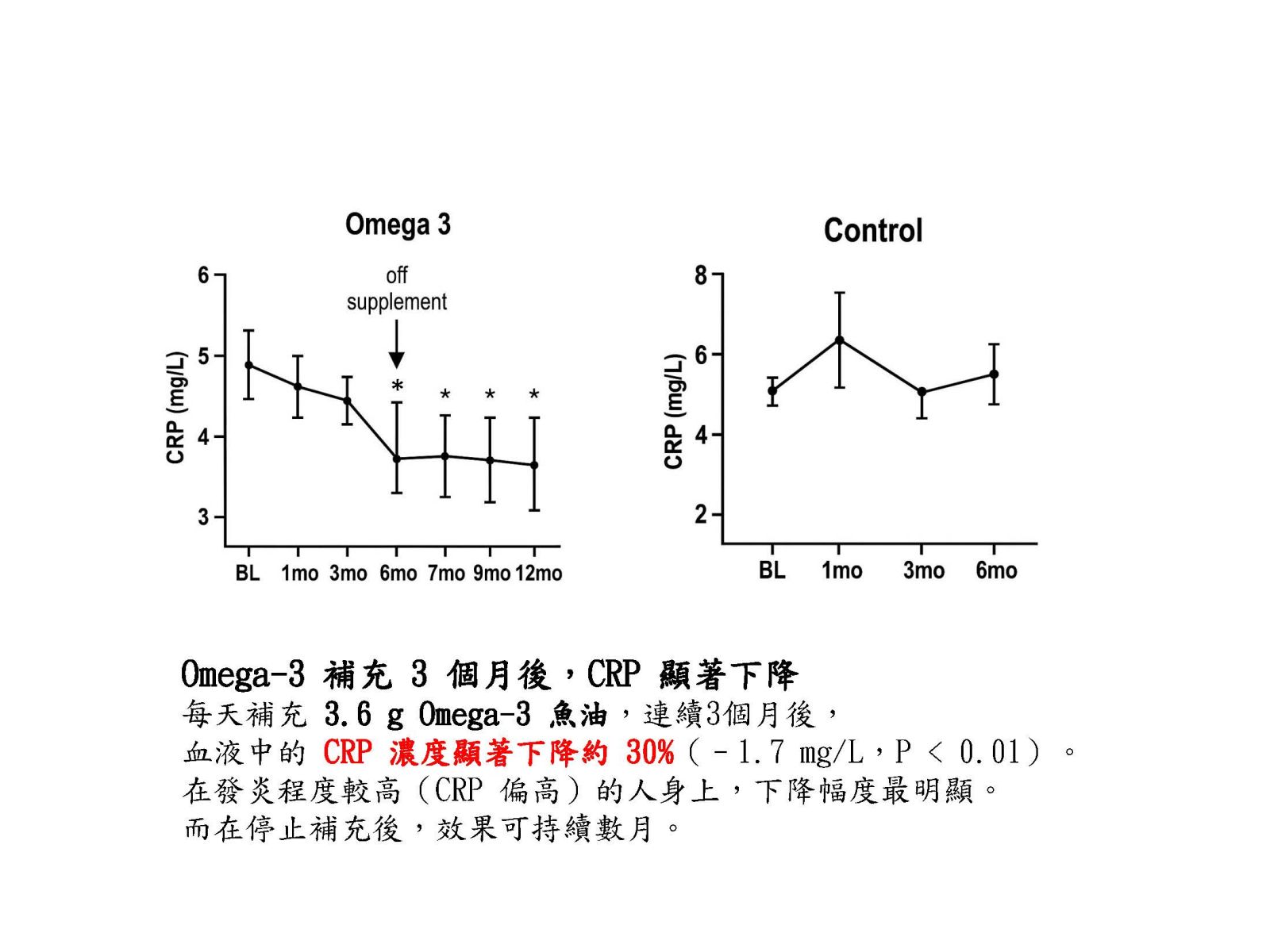 血液中的 CRP 濃度顯著下降約 30%(–1.7 mg/L,P < 0.01)。