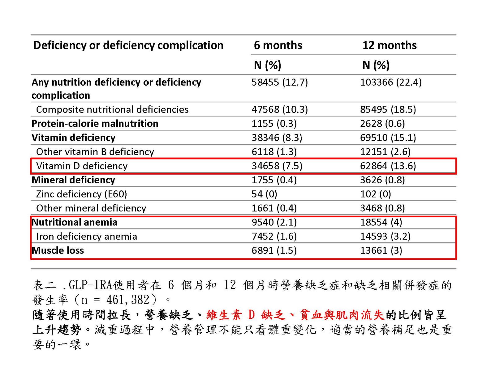 研究指出,在使用 GLP-1RA 後,除了體重下降之外,營養攝取不足相關問題的比例隨時間上升。其中,維生素 D 缺乏是最常被記錄到的項目;同時,研究也提醒,在快速減重的過程中,瘦體重流失是一個需要被留意的風險面向。