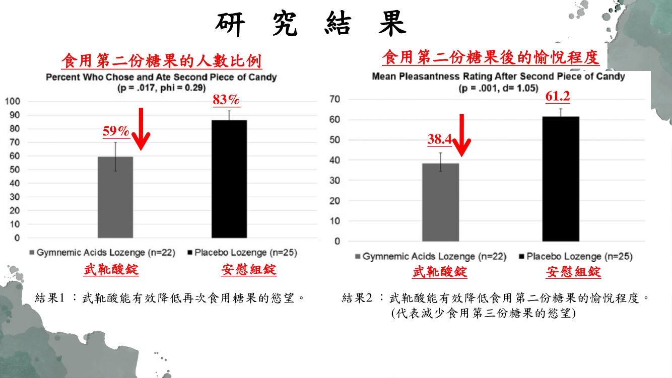 糖果、巧克力、軟糖等這類的甜食是普羅大眾無法抗拒的零嘴,但也因為體積較小的關係,常常一不小心就忽略了吃下肚得熱量而造成體重直線上升,如今根據2017年一篇美國研究證實了「武靴葉」所含的武靴酸能有效降低對甜食的慾望。科學家準備了許多甜點如M&Ms巧克力 、Kit Kat巧克力 、Twix巧克力 、Skittles彩虹糖 、 sour patch kids軟糖,讓受試者選擇自己喜歡吃的甜點並透過一系列實驗證實了食用武靴酸後能有像降低受試者再次食用甜點的慾望,對於正在減重或是控制飲食的患者可謂是多了一項利器!
