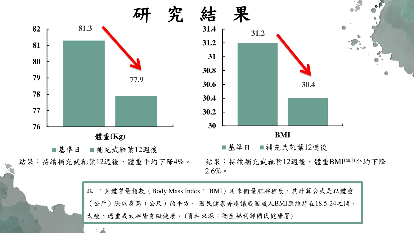 每當農曆過年後,因為春節「過年幸福肥」而造成體重些微上升,且隨著健康意識抬頭,越來越多人注意到體態的重要性,因此維持良好的體重及運動習慣並搭配均衡健康飲食是促進健康的不二法門,而目前也越來越多營養素被證實舉有輔助減重的效果。根據2017年一篇北美科學家證實,針對患有代謝症候群受試者,持續補充「武靴葉」12週後,發現受試者體重平均下降3.4公斤,BMI數值也因此下降0.8,因此若想補充更好改變體態的營養素,武靴葉會是個不錯的選擇!
