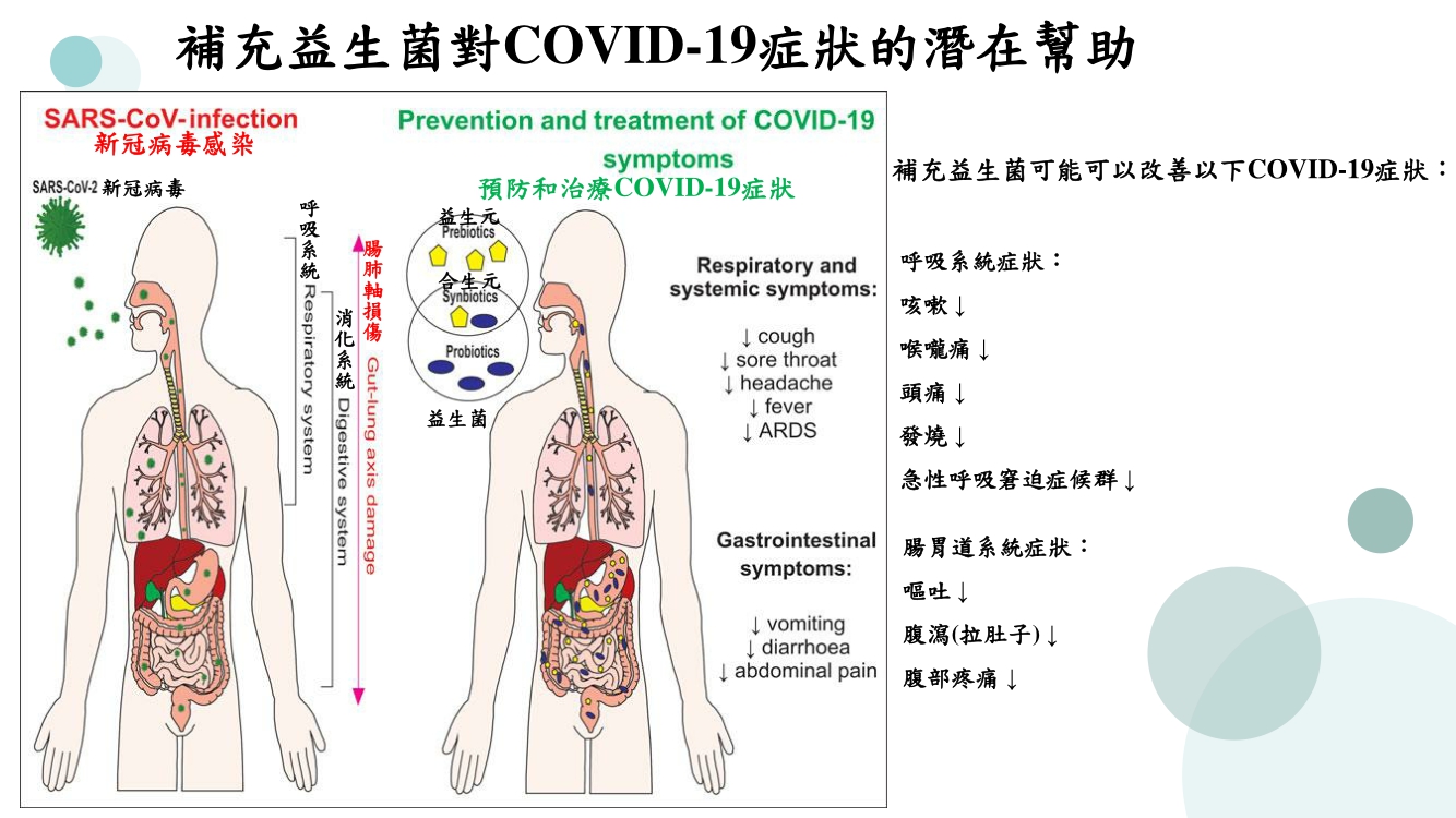 隨著台灣確診人數節節攀升,對於能改善染疫症狀的感冒藥、止痛藥等也成為家中必備藥品之一,但其中體內還有一群正在默默防疫的抗病毒軍隊-「益生菌」,根據研究指出,新冠病毒會透過感染肺部後並經由腸肺軸關係也造成腸道損傷,因此補充益生菌相關成分可能可以幫助改善呼吸系統症狀(如咳嗽、喉嚨痛、頭痛、發燒、等)以及腸道系統症狀(如嘔吐、腹瀉(拉肚子)、腹部疼痛), 所以除了必備藥品外,補充益生菌也是個很好的選擇之一喔!