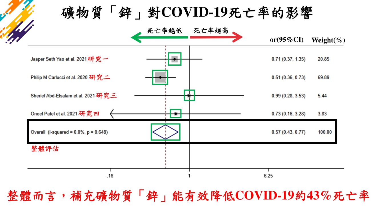 近期國內確診人數已降至2萬案例以下,但死亡人數仍然具有規模,該如何降低國內新冠疫情的死亡率呢?除了提供良好的醫療環境外,營養方面也是不可或缺的!根據國外伊朗研究指出,從501篇研究透過嚴謹條件篩選出了5篇研究後得知,礦物質「鋅」能有效降低43%的COVID-19死亡率,而鋅能提升體內免疫細胞功能作用,因此除了補充維生素D外,也不妨從礦物質角度中補充鋅,藉此也可達到均衡營養的效果並降低新冠疫情死亡率!