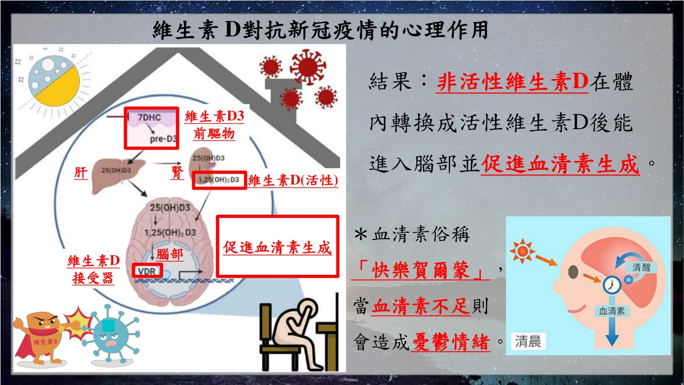 自台灣升為三級警戒以來,許多民眾為了配合防疫規定而大幅降低出門頻率並減少不必要的移動,但此舉也造成人們從陽光攝取維生素D的機會大幅降低,甚至部分民眾在心理上逐漸產生負面的憂鬱情緒,根據近期研究指出,維生素D在經由體內肝臟與腎臟轉換後能進入腦部並促進腦部分泌血清素,而血清素俗稱「快樂賀爾蒙」,當血清素不足時則會造成憂鬱情緒產生,這結果對於長期待在家中的族群而言無疑又新增了一種調節情緒的方法,也再次證實了維生素D對人體的幫助!