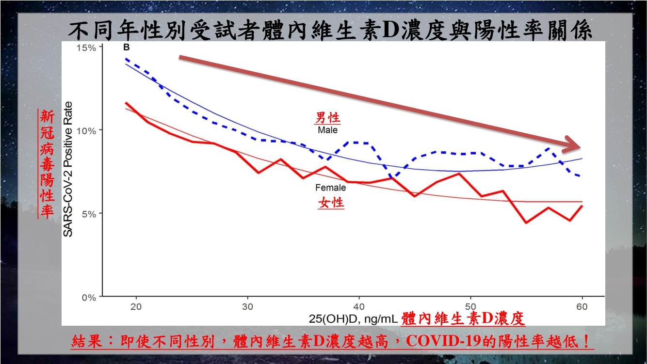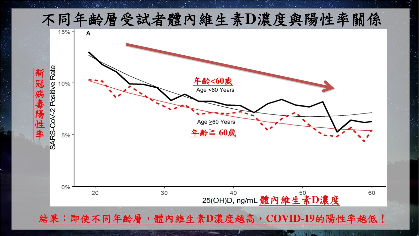 維生素D對新冠疫情的研究一直是各國學者熱衷研究的課題,根據美國波士頓大學與奎斯特診斷實驗室聯合分析,收錄了美國50洲共19萬位受試者並觀察體內維生素D濃度與新冠病毒的相關性,結果發現體內維生素D濃度越低的受試者,新冠病毒的陽性率就越高,反之亦然,而這種相關性無論以年齡(65歲)或以性別區分都能得到一樣的結果,也再次證實人體內維生素D濃度高低與新冠疫情具有高相關性!