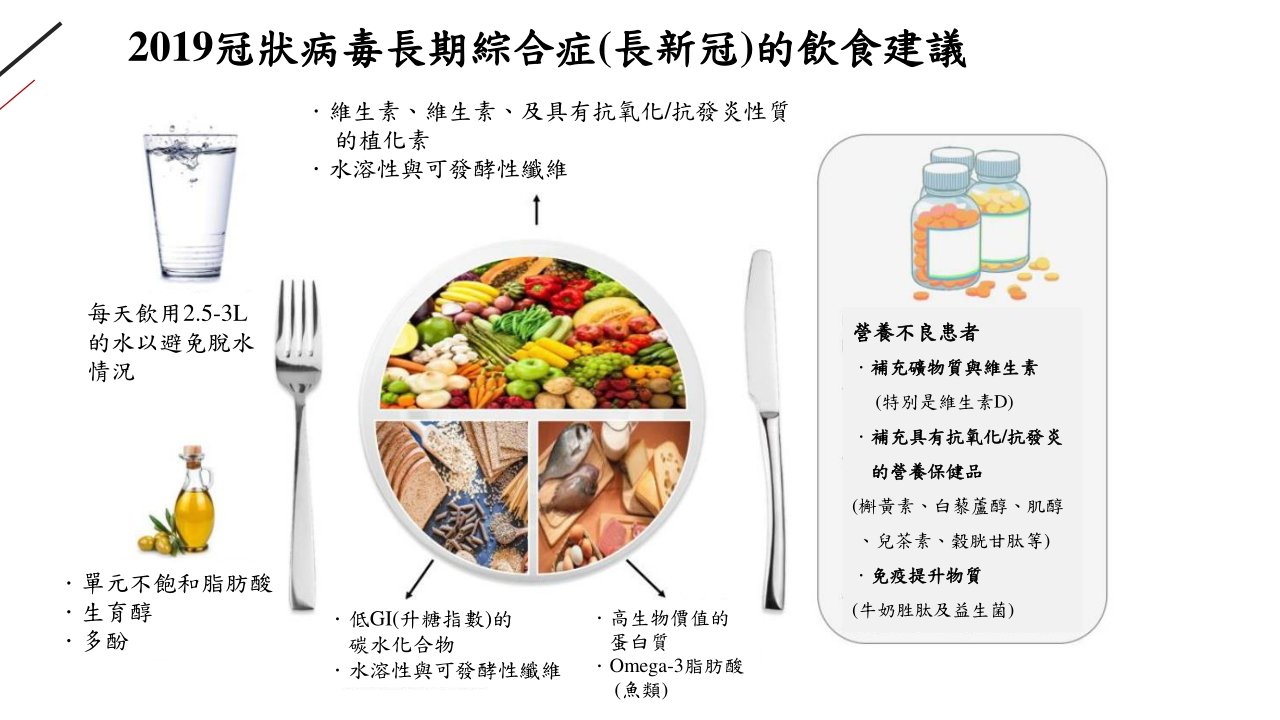 根據衛生福利部疾病管制署統計,國內確診人數已超過600萬人,且根據國外研究長新冠比率可能高達37-50%,表示平均每2-3人就會有1人具有長新冠症狀,而對於長新冠族群在飲食上有哪些建議呢?根據文獻指出,若有長新冠患者在飲食上有以下幾點建議:1.每日補充足量水分(2.5-3L) 2.多攝取含有抗氧化/抗發炎植化訴的蔬果3.食用優質油脂與高生物價值蛋白質及低升糖指數醣類來源4.在營養補充方面可以補充基礎礦物質與維生素(特別是維生素D)、抗氧化/抗發炎營養素及提升免疫力成分,相信透過這些飲食建議就能夠幫助長新冠患者早日恢復!