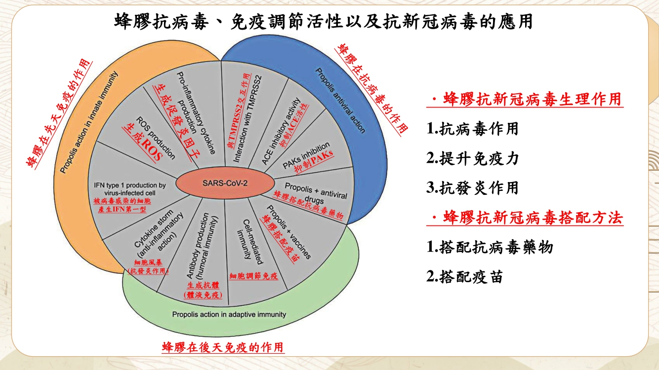 蜜蜂能夠生產出許多不同種類的蜂產品,例如蜂蜜、蜂膠、蜂蠟、蜂王乳等等,根據2021年巴西聖保羅大學研究指出,蜂膠在對抗新冠病毒具有多種功效,例如抗病毒、提升免疫力與抗發炎作用,而且還能夠與抗病毒藥物與疫苗搭配使用來達到相輔相成的效果,在現今新冠疫情仍持續流行的時期,除了可以透過施打疫苗來獲得抗體外,藉由大自然的瑰寶來提升自我保護力也是適當的選擇之一喔!
