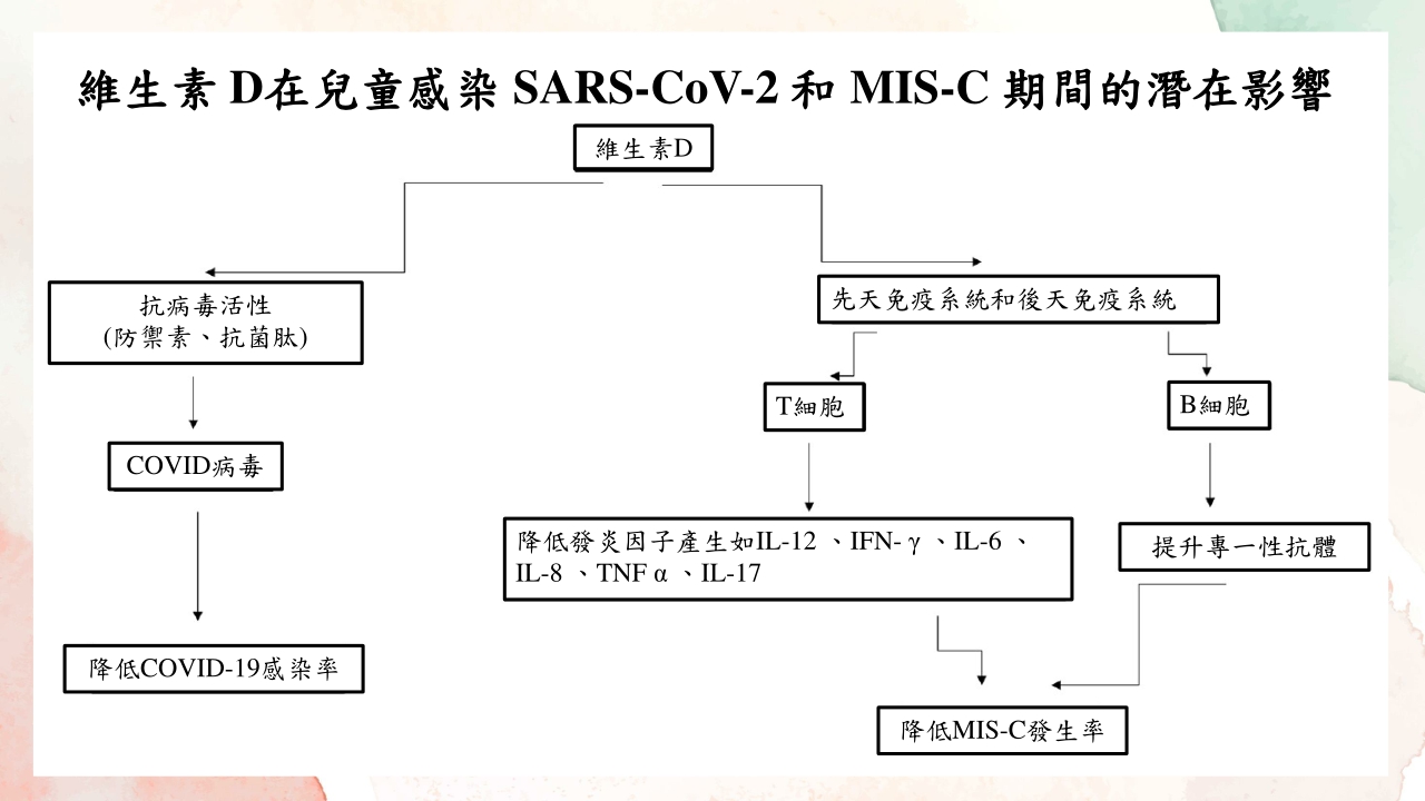 MIS-C為孩童多系統炎症徵候群,是國內年齡層介於0-19歲孩童感染COVID-19後罕見的高度炎性反應及多器官系統損傷,國外統計致死率可達1-2%,而國內也已累積近百例的孩童MIS-C案例,根據文獻研究指出,維生素D可以透過免疫調節作用來調節體內免疫細胞,並藉此降低體內發炎因子產生以及提升專一性抗體的效果,進而可以降低MIS-C的發生率,因此適時補充維生素D並維持體內維生素D血液濃度除了可以降低COVID-19感染率外,對MIS-C也會有適當幫助喔!