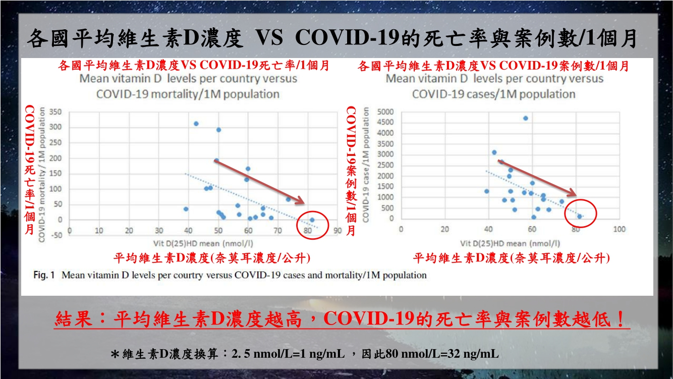 截至今年(2021)一月底前,全球新冠肺炎確診人數已突破一億人,可見世界各國的疫情仍然嚴峻,而近期發現許多維生素D其實與呼吸道系統與免疫能力的相關性證據,因此英國學者針對歐洲總計20個國家蒐集了該國一個月內的新冠肺炎確診患者的體內維生素D濃度並進行分析,發現如果體內維生素D濃度越高的國家,無論是在新冠肺炎確診案例以及患者的死亡率都越低,代表呈現負相關性,因此建議民眾可以適度補充維生素D並將體內維生素D濃度提升至32 ng/mL以上,讓自身能大幅降低被感染的風險!