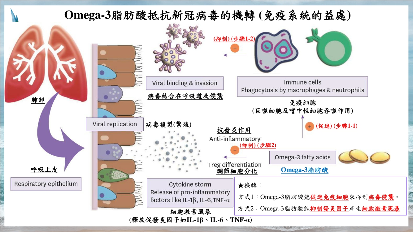 只要提到魚油,最廣為人知的營養素就是EPA和DHA,而EPA和DHA是屬於「Omega-3脂肪酸」,根據2020年由多位美國科學家所證實有關Omega-3脂肪酸在新冠病毒(COVID-19)上的抵抗效果發現,Omega-3脂肪酸可以透過兩種方式來達到對抗新冠病毒的效果,方式一:透過增強人體免疫系統來增強抵抗力;方式二:透過降低體內發炎物質來避免大量發炎物質累積而引起的連鎖反應-細胞激素風暴,這些方式都是對抗新冠病毒的多項利器,因此若是平常較少攝取魚類地的民眾,建議可以透過較高Omega-3濃度的魚油產品來補充!