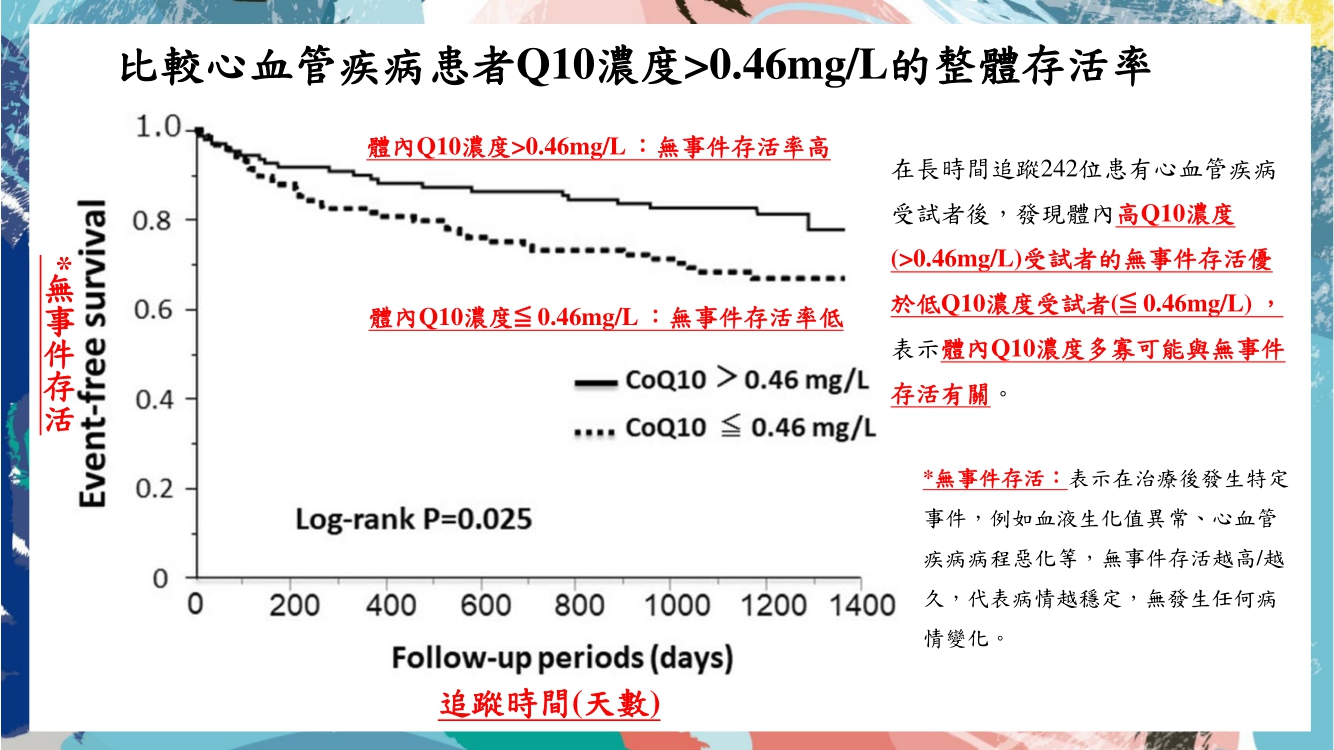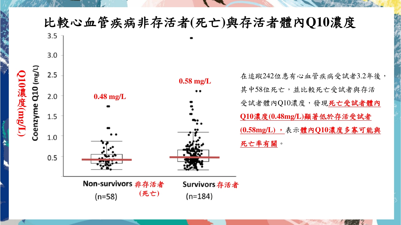隨著年齡的增長,心臟的輔酶Q10濃度會隨之下降,而輔酶Q10又分為氧化型Q10和還原型Q10,其中在心臟所含氧化型Q10濃度(132μg/g)是還原型Q10(61μg/g)的2倍以上,表示補充氧化型Q10對心臟來說更為重要,此外體內Q10濃度高低也會影響心血管疾病患者的死亡率,根據研究指出,在追蹤242位患有心血管疾病受試者3.2年後,並比較死亡受試者與存活受試者體內Q10濃度,發現死亡受試者體內Q10濃度(0.48mg/L)顯著低於存活受試者(0.58mg/L) ,表示體內Q10濃度多寡可能與死亡率有關,而且在無事件存活也看到類似的結果,因此適時補充Q10是可以提供更好的心血管疾病結果哦!