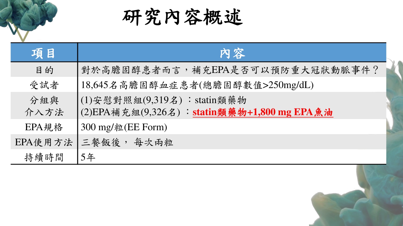 高血脂症現在已成為常見國民病之一,而司他汀類藥物(Statins)就成為臨床上最常開立的降血脂藥物,其作用主要是抑制肝細胞中的膽固醇合成相關酵素來達到降血脂的目的。根據2007年一篇發表在《刺胳針》雜誌的日本研究指出,針對高膽固醇血症患者,若每日服用司他汀類藥物且合併補充1,800 mg的EPA,持續5年後,能有效降低19%重大冠狀動脈事件發生率,證實有在服用降血脂藥物患者若能搭配EPA魚油補充的話,是有其必要性以及益處的,因此不妨可以在服用藥物的同時搭配營養素,可以達到1+1>2的效用喔!
