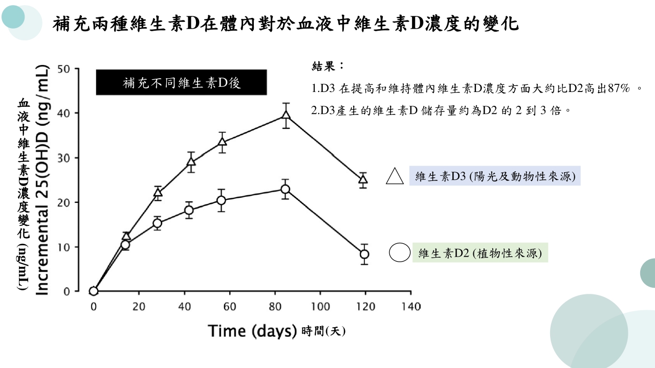 隨著科學家對維生素D的研究越透徹,越能夠發現維生素D對人體的重要性,從一開始的骨骼益處到現在的降低疾病發生率,甚至是現今的疫情影響,都顯示出維生素D的好處,但常見的維生素D其實分為維生素D3(陽光及動物性來源)和維生素D2(植物性來源),根據研究指出’, 維生素D3 在提高和維持體內維生素D濃度方面大約比維生素D2高出87%;而且維生素D3產生的維生素D 儲存量約為維生素D2 的 2 到 3 倍,因此在補充維生素D時,不妨了解維生素D的種類,對於效果上的感受度會更為明顯喔!