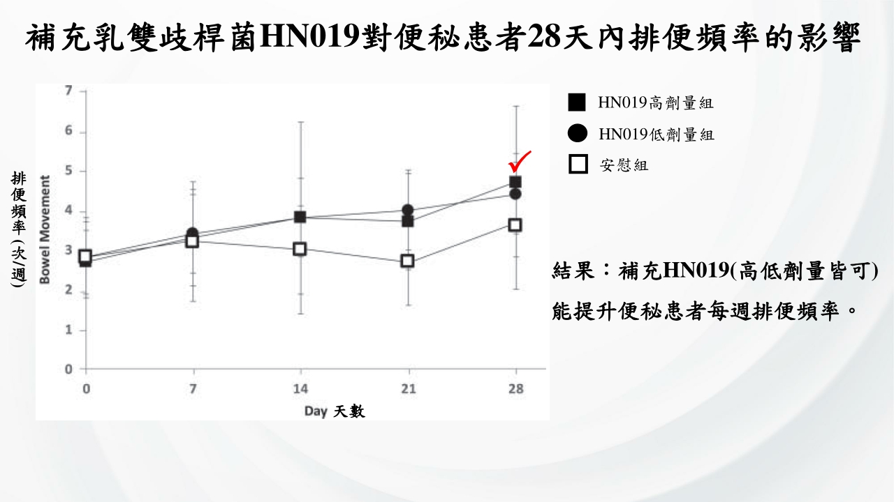 腸道是人體重要的免疫器官之一,也是人體很仰賴的排毒器官,而養成良好的排便習慣是維持人體健康及腸道環境非常重要的一環,根據研究指出,補充乳雙歧桿菌HN019能夠提升具有改善便秘情況的效果,在適量補充下能夠提升每週的腸道排便頻率,對於有便秘情況的人可以說是一大福音,不但可以提升毒素排出的頻率,也可以減少罹患大腸癌的發生率,因此養成良好的排便習慣可以說是好處多多!