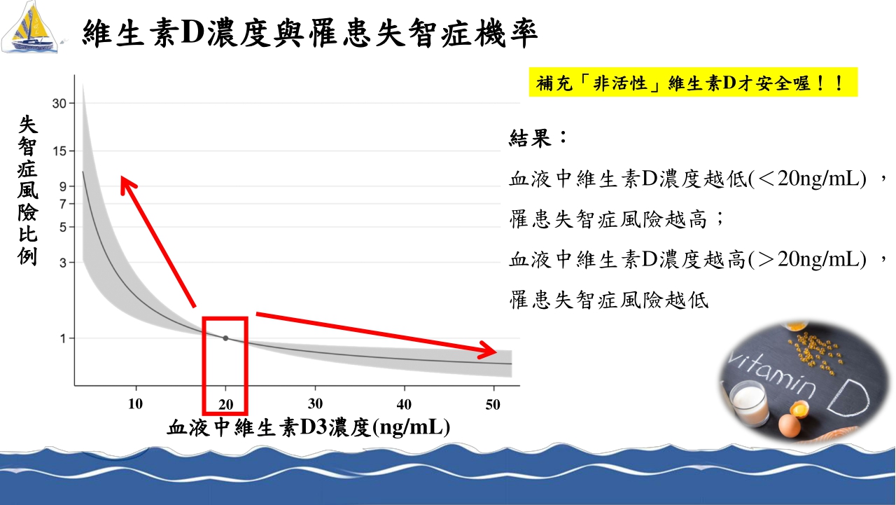 近期的「活性」維生素D可能造成老年人失智風險增加的資訊造成許多民眾的誤解,事實上維生素D形式有分為「活性」與「非活性」,活性維生素D屬於「藥品級」,需透過醫師、藥師才能夠購買;而一般市售的「食品級」維生素D就是屬於「非活性」,因此補充非活性維生素D並不會造成老年人失智風險增加,根據今年發表在《美國臨床營養學雜誌》研究指出,體內維生素D濃度越高(>20ng/mL),罹患失智症的風險是越低的,重點是要補充「非活性」維生素D,才能夠溫和無副作用的提升體內維生素D濃度哦!