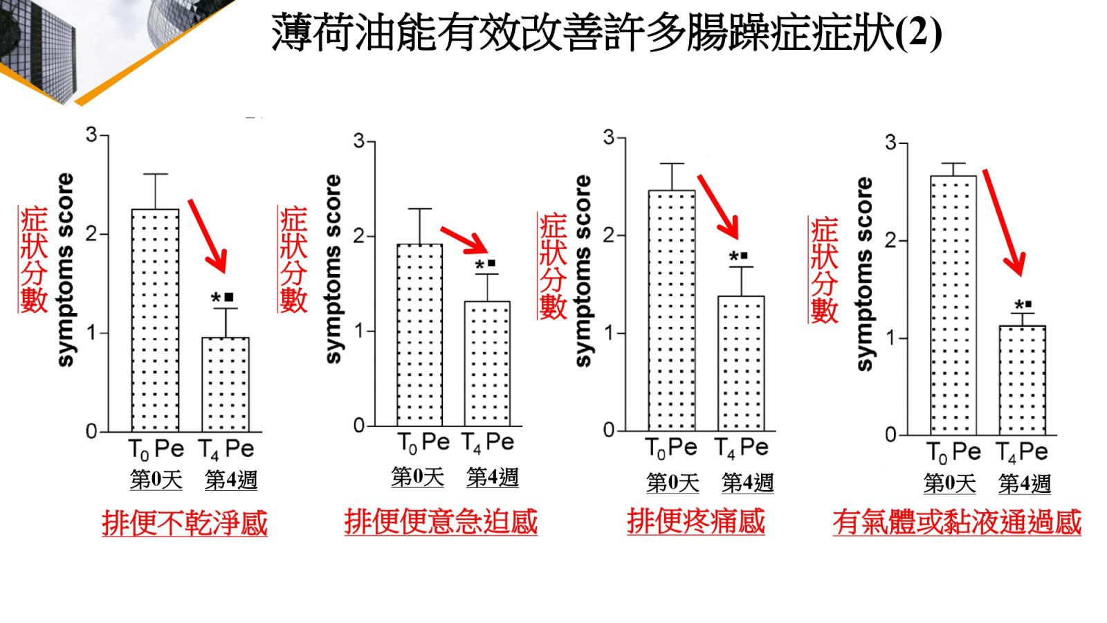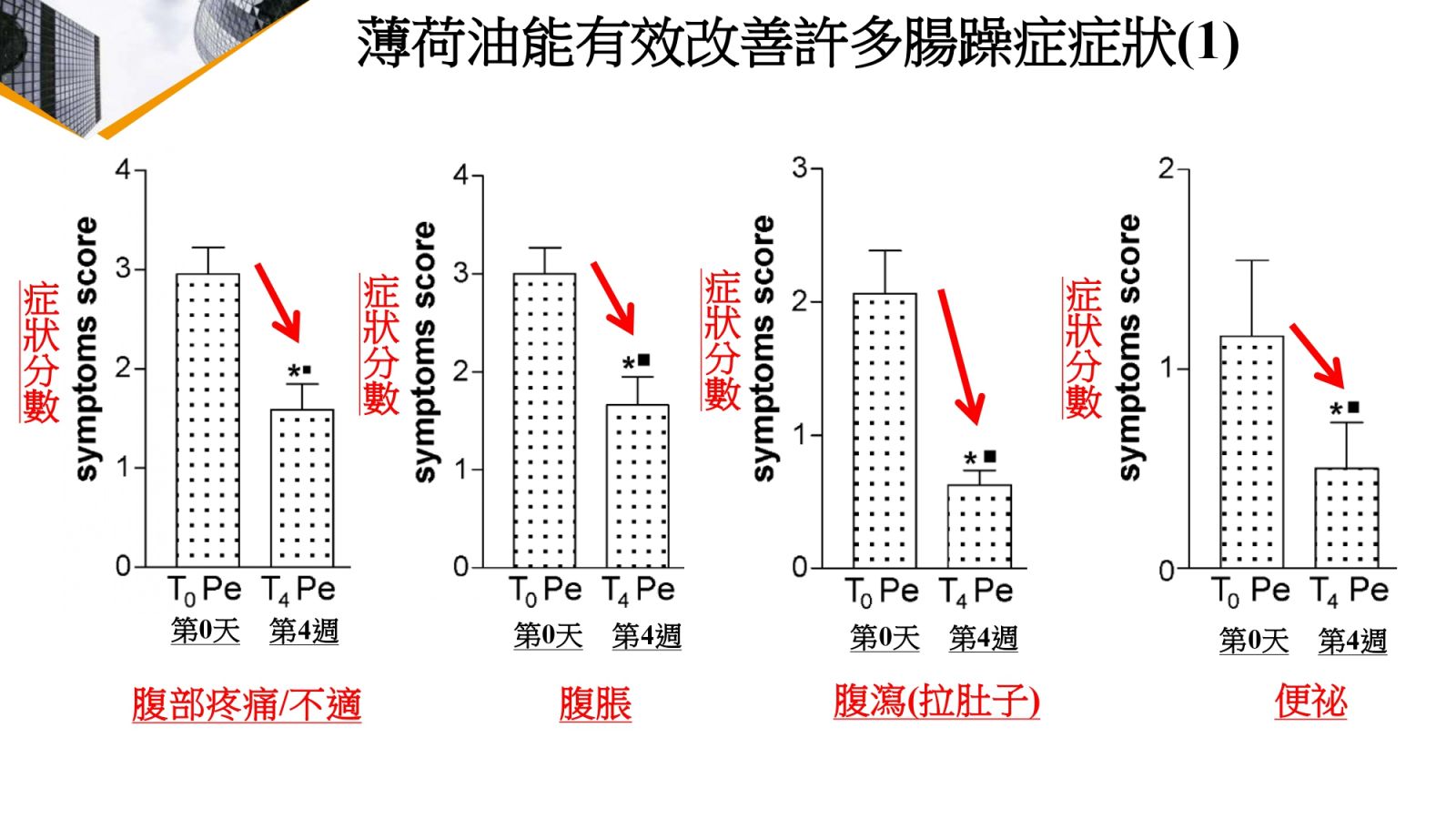腸躁症是容易被現代人忽略的疾病之一,而大腸激躁症的病因機轉還不明確,很多因素都可能影響腸道的蠕動功能與調節能力,而主要可能原因為腸道肌異常收縮而導致症狀產生如腹部疼痛/不適、腹脹、腹瀉(拉肚子)、便祕、排便不乾淨感等,根據研究指出,薄荷油能有效幫助異常緊繃的腸道肌,使腸道肌放鬆並改善腸躁症症狀,因此薄荷油也是幫助舒緩腸躁症症狀的營養素之一!
