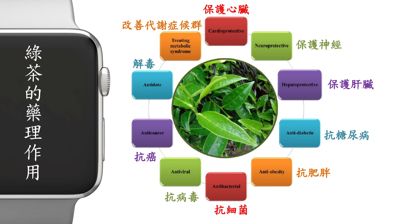 綠茶在台灣的飲食習慣中是很常見的一種茶類飲品,無論是自家沖泡茶葉、或是便利超商的綠茶飲料,甚至是手搖店所販售的綠茶飲品,都顯示綠茶在台灣的普遍性,而綠茶所富含的諸多種類的兒茶素例如表沒食子兒茶素沒食子酸酯(EGCG)、表沒食子兒茶素(EGC)、表兒茶素沒食子酸酯(ECG)、表兒茶素(EC),而且研究指出比較不同種茶類(綠茶、紅茶、博士茶、烏龍茶)中所含EGCG,其中綠茶的含量是在比較茶類中含量最高,約為紅茶的3倍、烏龍茶的7倍、博士茶的27倍,因此綠茶具有許多功效例如(1)保護心臟 (2)保護神經(3)保護肝臟(4)抗糖尿病(5)抗肥胖(6)抗細菌(7)抗病毒(8)抗癌(9)解毒(10)改善代謝症候群等等,因此適量的補充綠茶是好處多多!